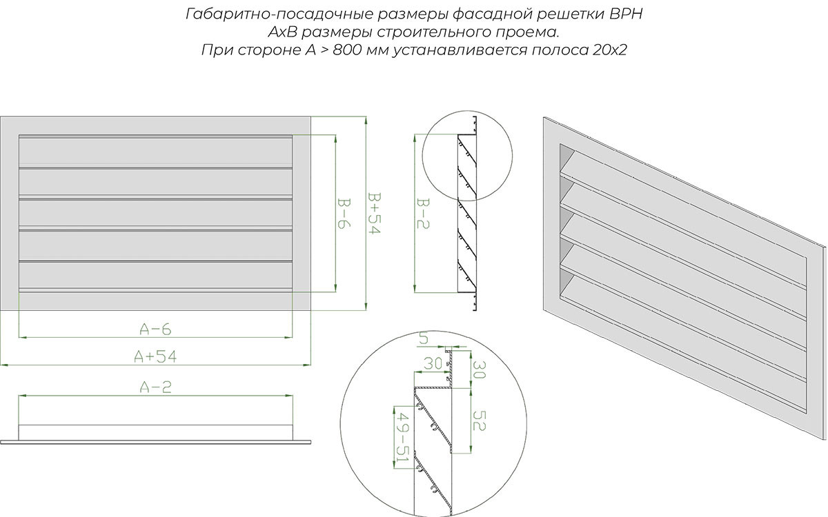 Цельные жалюзийные алюминиевые решетки ВРН рекомендуется изготавливать площадью не более 2 м². При размере более 2 м² решетка изготавливается из составных частей.