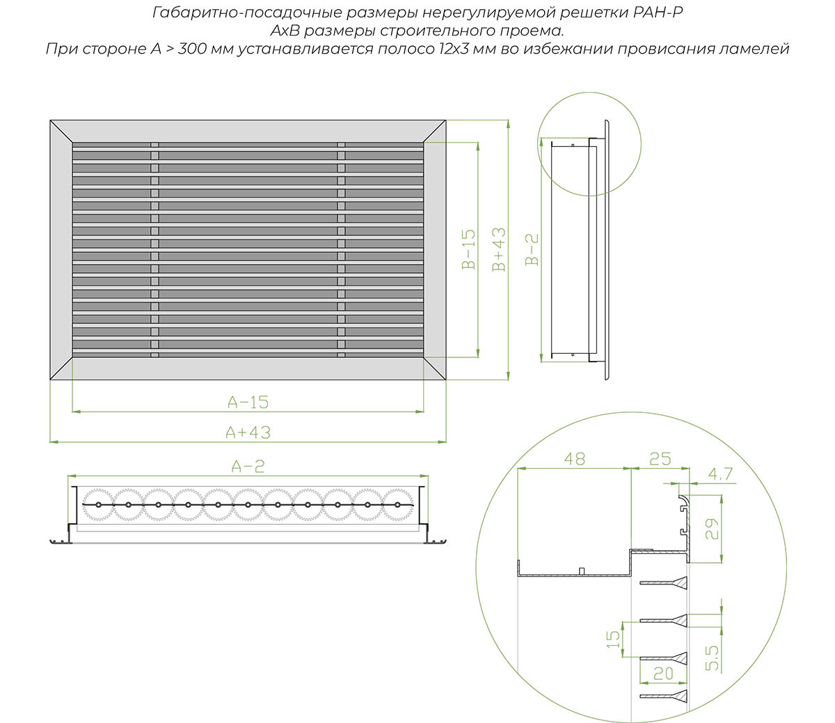 По дополнительному запросу решетки РАН-Р могут быть оснащены отверстиями, расположенными на лицевой стороне рамки для крепления с помощью винтового соединения. Предусмотрена возможность комплектации адаптером для присоединения к воздуховоду.