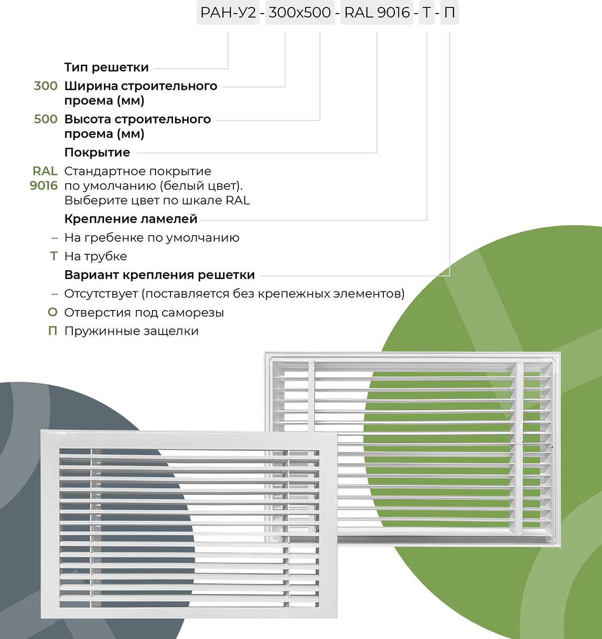 По дополнительному запросу решетки РАН-У2 могут быть оснащены пружинной защелкой для скрытого монтажа либо отверстиями, расположенными на лицевой стороне рамки для крепления с помощью винтового соединения. Предусмотрена возможность оснащения клапаном расхода воздуха и адаптером для присоединения к воздуховоду.
