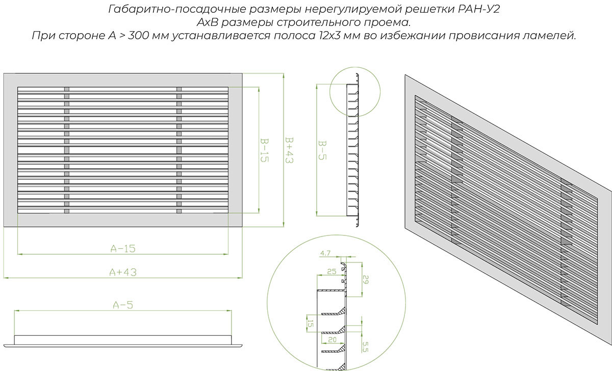 Нерегулируемая решетка РАН-У2 используется в приточно-вытяжной вентиляции и системах кондиционирования воздуха и предназначена для монтажа в вентиляционные каналы и строительные проемы различных типов и назначений.