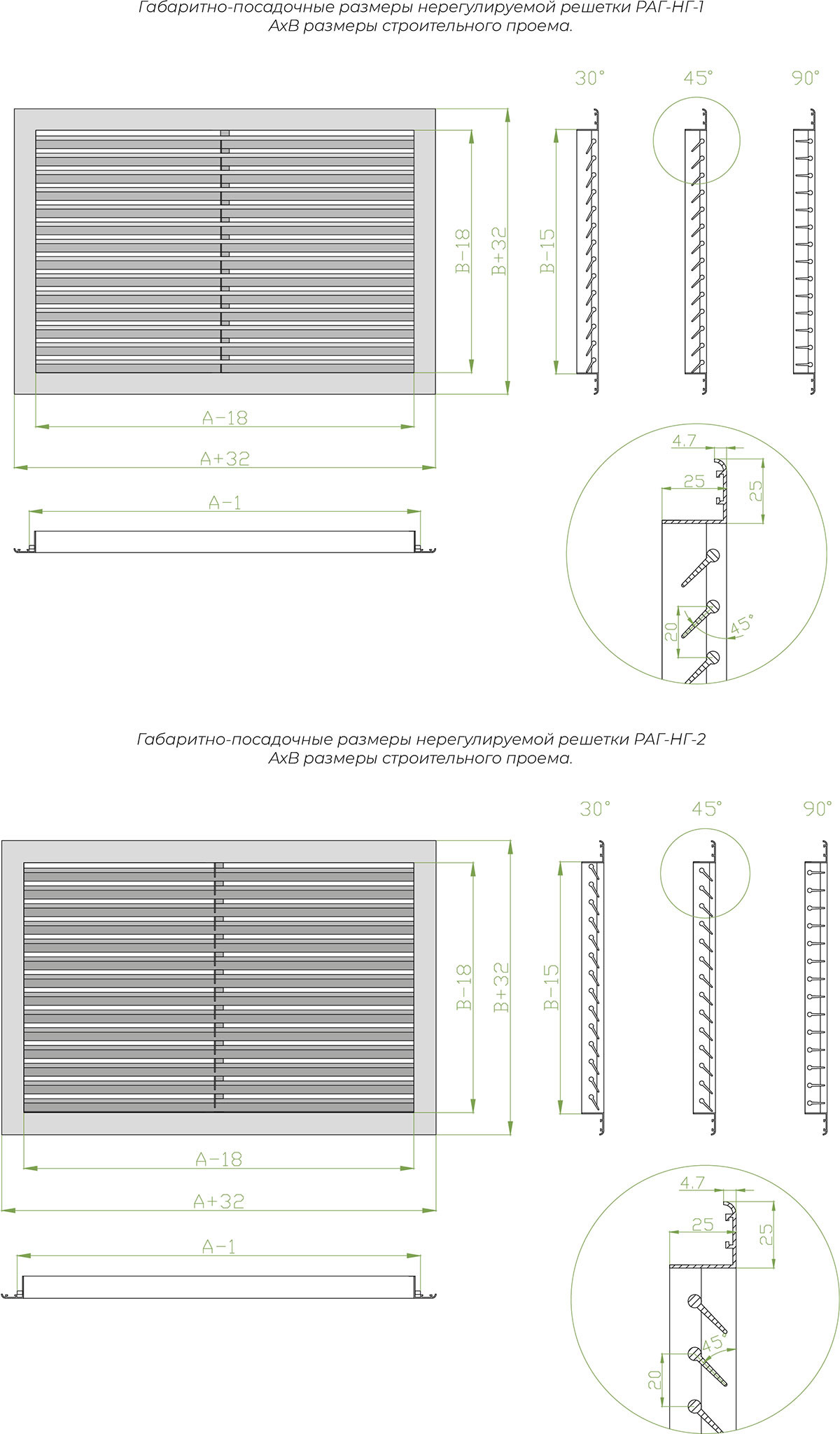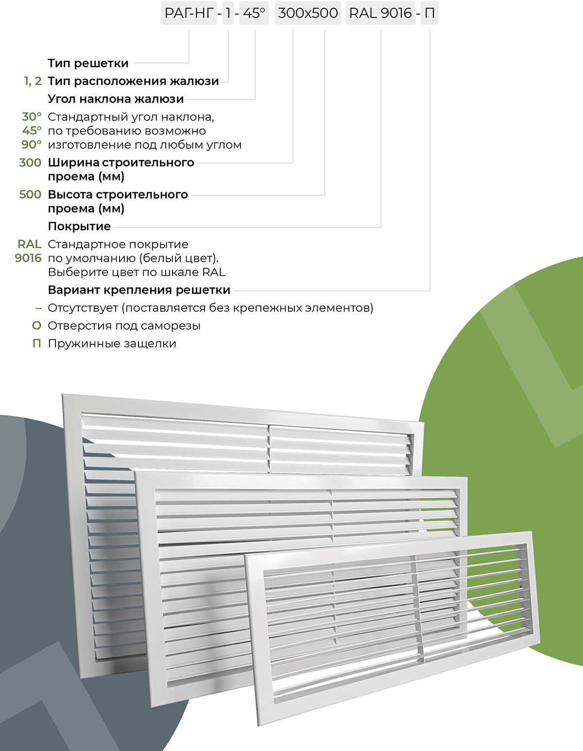 Решетка имеет рамку и горизонтально расположенные каплеобразные жалюзи, которые могут быть зафиксированы под углом 30˚, 45˚ и 90˚ специальной пластиной с вырезами, что исключает провисание жалюзи и повышает эстетический вид изделия. Жалюзи возможно расположить по типу 1 во внутреннюю сторону (РАГ-НГ-1) и по типу 2 во внешнюю сторону (РАГ-НГ-2).