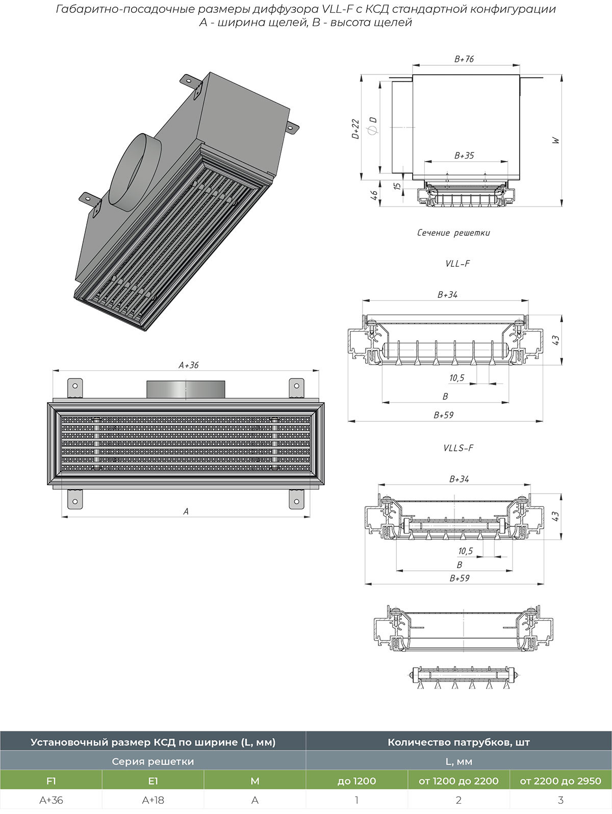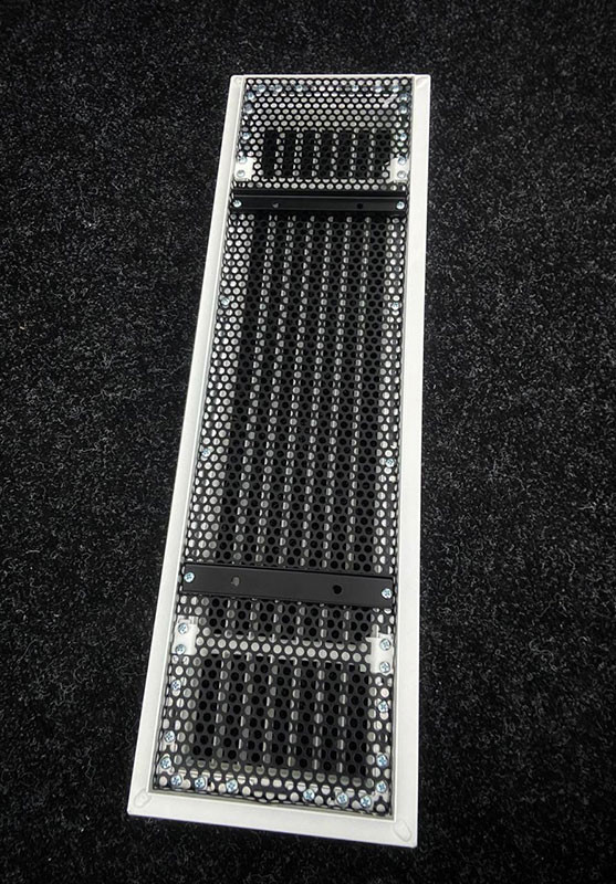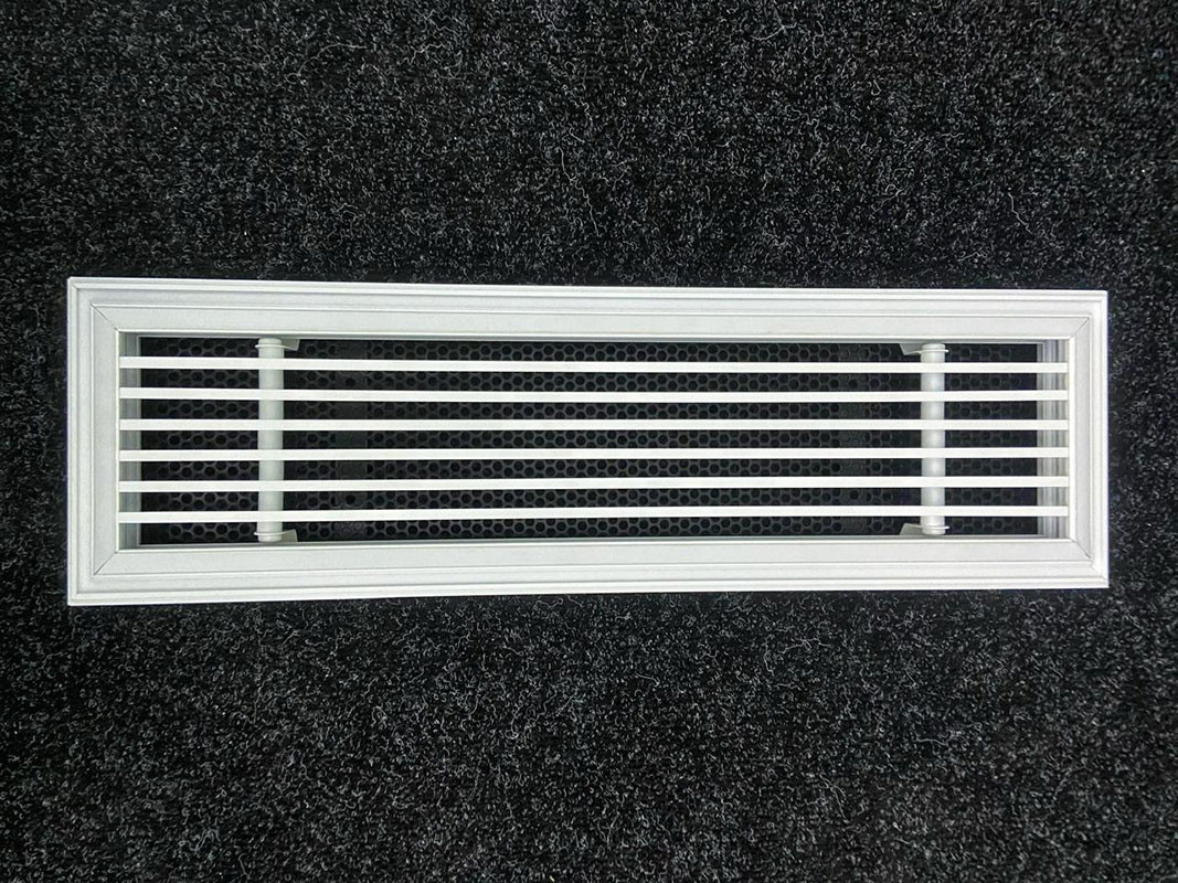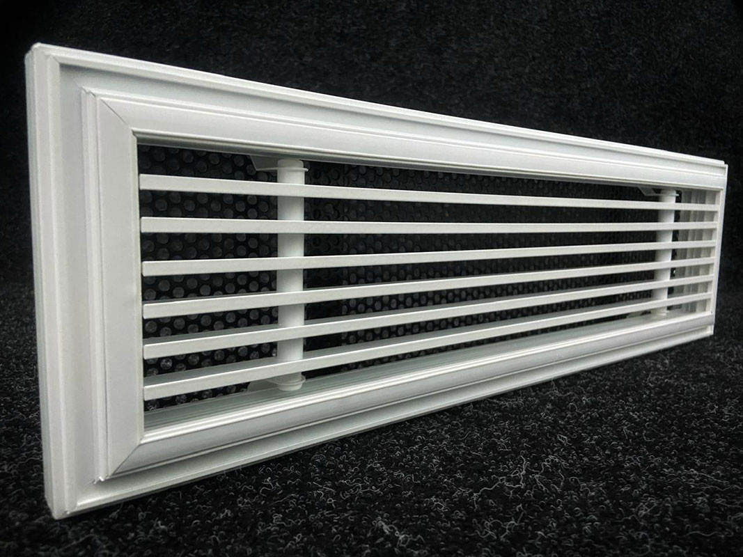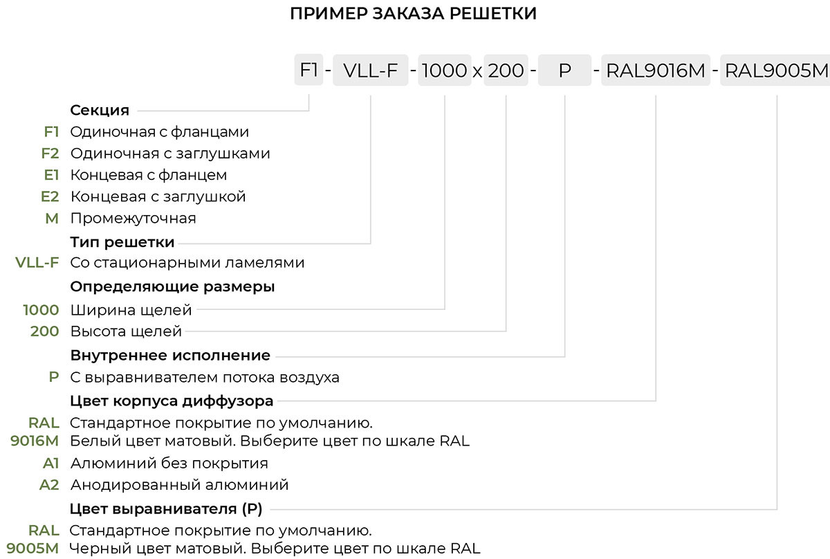 Используемые материалы. Щелевые решетки VLL-F и VLLS-F изготавливаются из экструдированного алюминиевого профиля АД31 по ГОСТ 22233-2018. По умолчанию корпус решетки окрашивается в стандартный белый цвет RAL 9016М матовый, а внутреннее исполнение в чёрный цвет RAL9005М матовый. По индивидуальному заказу возможна окраска в любой цвет по шкале RAL. Статическая камера изготавливается из оцинкованной листовой стали 0,4 - 1,5 мм в зависимости от размера и пожелания заказчика. По умолчанию все изделия поставляются в неокрашенном виде.