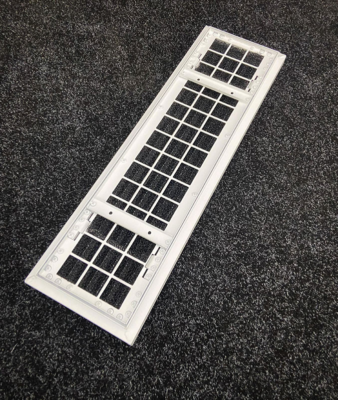 Используемые материалы. Щелевые решетки VLL-F и VLLS-F изготавливаются из экструдированного алюминиевого профиля АД31 по ГОСТ 22233-2018. По умолчанию корпус решетки окрашивается в стандартный белый цвет RAL 9016М матовый, а внутреннее исполнение в чёрный цвет RAL9005М матовый. По индивидуальному заказу возможна окраска в любой цвет по шкале RAL. Статическая камера изготавливается из оцинкованной листовой стали 0,4 - 1,5 мм в зависимости от размера и пожелания заказчика. По умолчанию все изделия поставляются в неокрашенном виде.