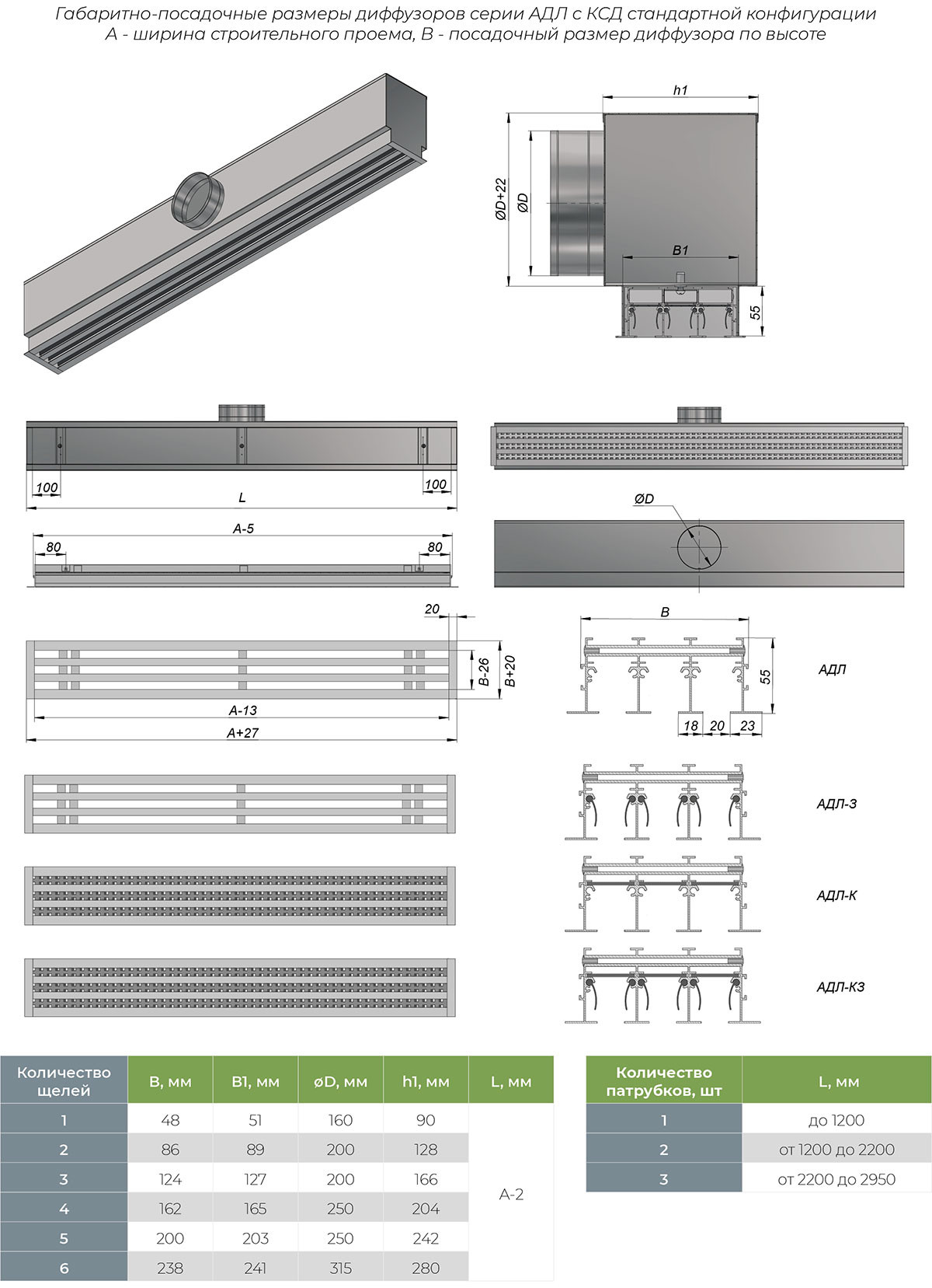 Щелевой диффузор АДЛ представляет собой вытяжную секцию без ламелей и без клапана расхода воздуха с высоким коэффициентом живого сечения. Относительно других моделей решеток этой серии, АДЛ имеет небольшой вес и более низкую стоимость. Могут быть самостоятельным изделием в виде одиночной секции или ее составной частью. После монтажа рамка решетки остается видимой, закрывая проем. Возможное количество щелей от 1 до 10.