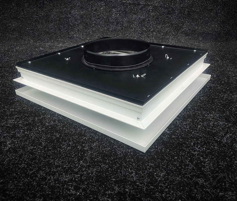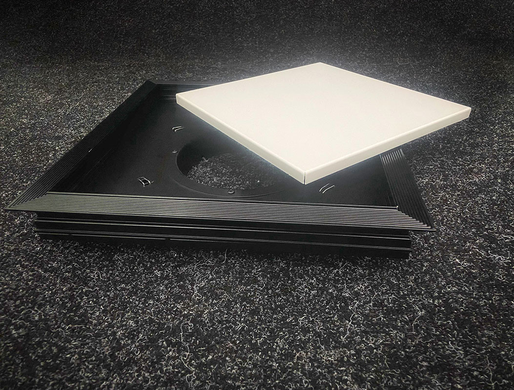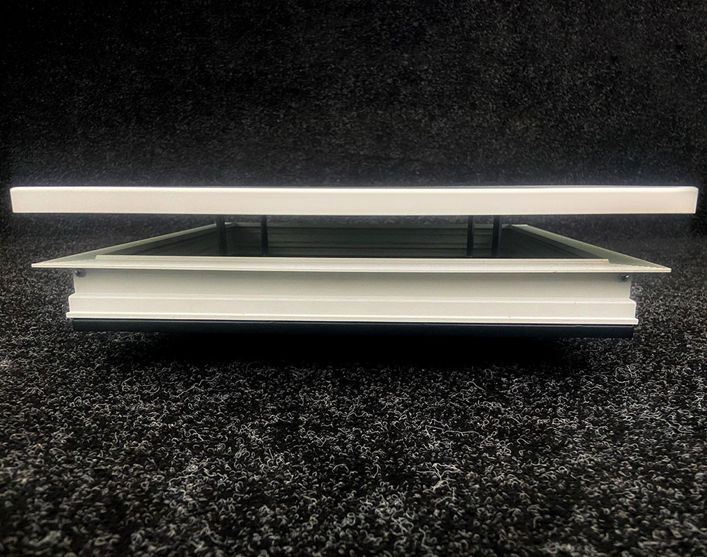 Диффузор представляет собой корпус с патрубком круглого сечения и съемную лицевую панель. Конструкция профиля рамки предусматривает фланец под шпаклевку с пазами специальной формы для лучшей адгезии. После монтажа видимой частью в помещении остается только щель.