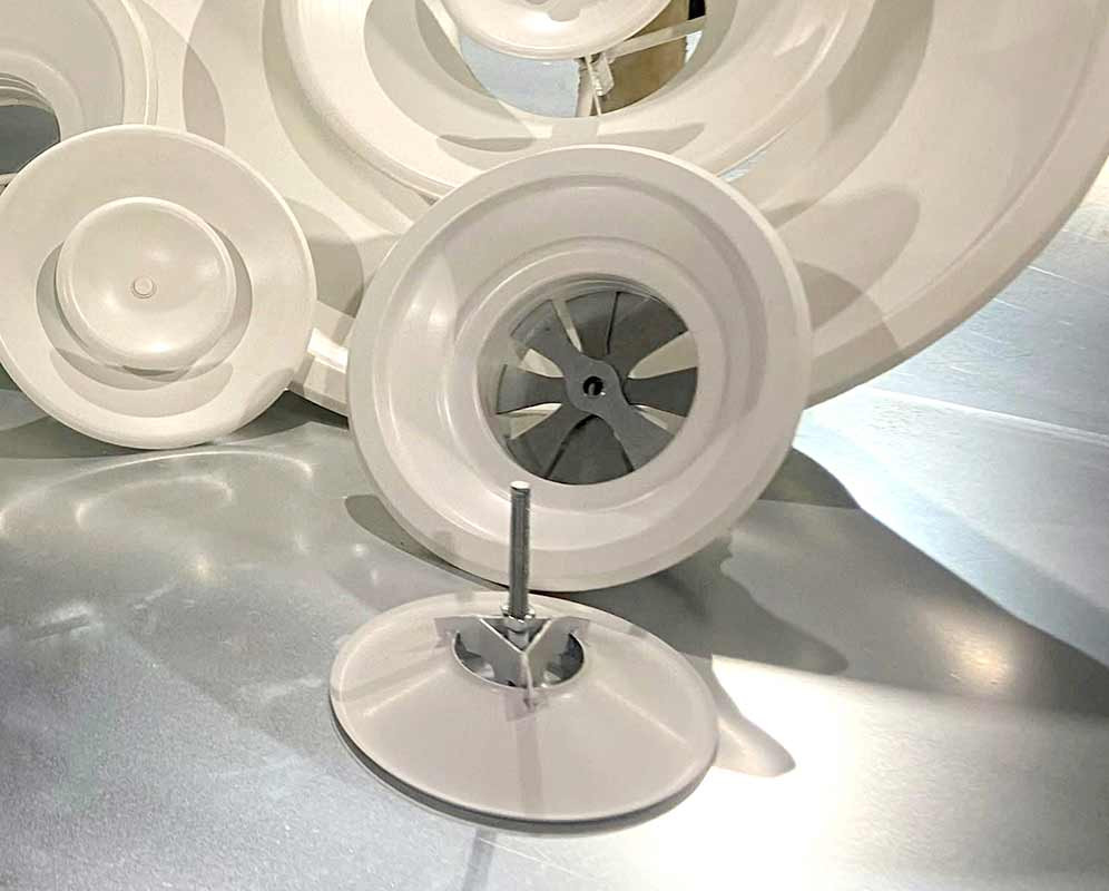 Корпус диффузора состоит из впускного наружного конуса и съемной центральной части, состоящей из нескольких конусов меньшего диаметра. Съемная часть позволяет регулировать направление потока воздуха, а также при необходимости производить очистку и иметь доступ к воздуховоду или камере.