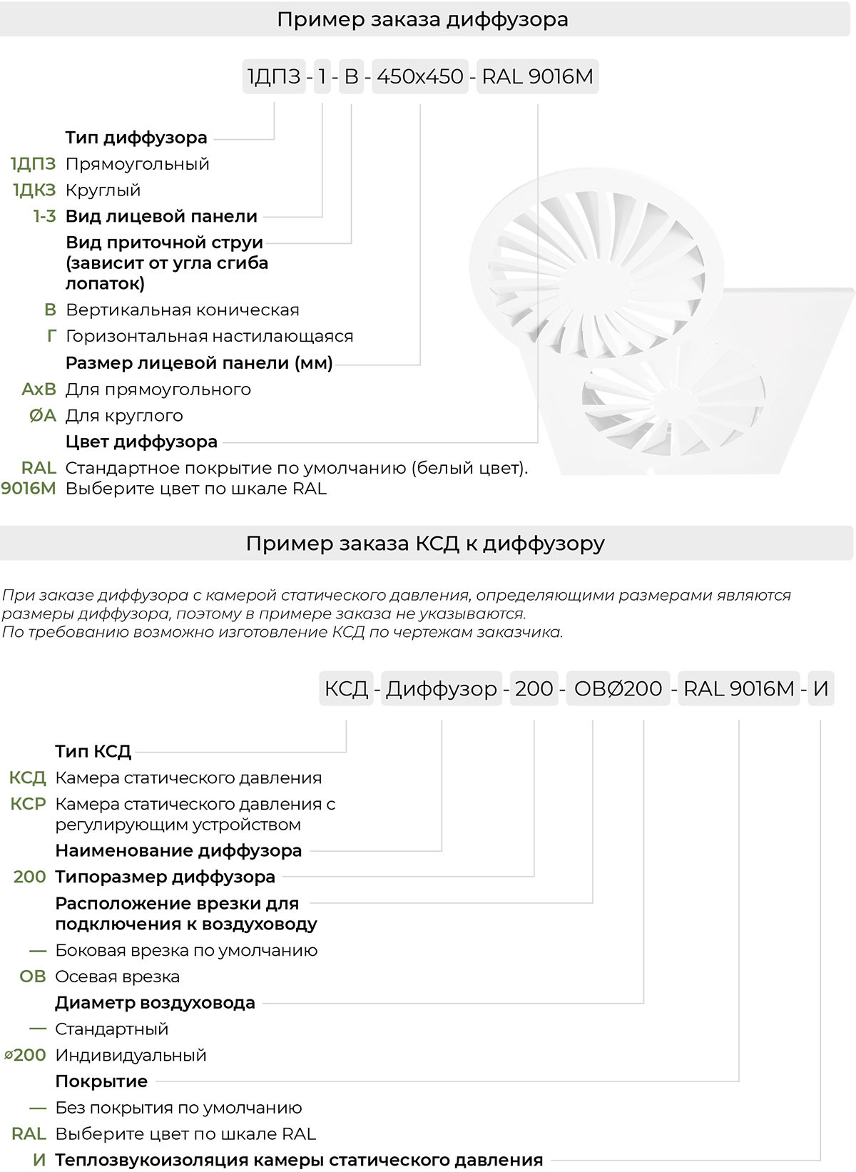 Диффузоры изготавливаются из стали и окрашиваются методом порошкового напыления в белый цвет по умолчанию RAL 9016M (матовый). По требованию возможна окраска в любой цвет по каталогу RAL.