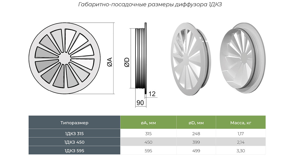Конструкция диффузоров представляет собой панель круглой формы с закручивающими лопатками с заданным углом и присоединительным патрубком круглого сечения на тыльной стороне диффузора.